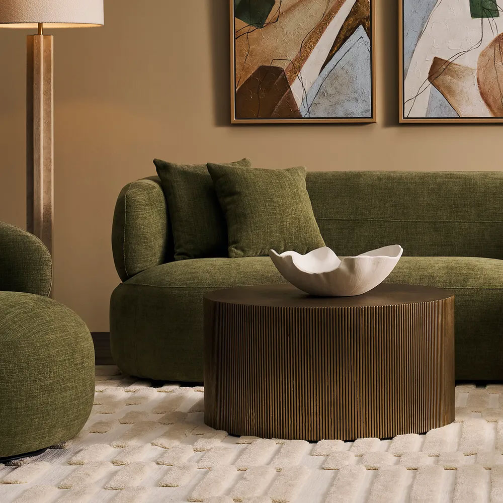 Featuring a hand crafted brass clad exterior enriched with a hammered finish top and pinstripe detailed side, the lustrous brass finish of the cylindrical Chadwick coffee table embellishes the interiors it inhabits with a distinct sense of luxe.
