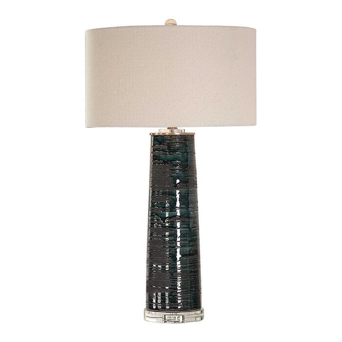 Slightly tapered ceramic base, finished in a heavily distressed aged teal glaze with black distressing and dark charcoal undertones, accented with thick crystal details.