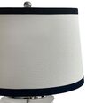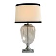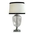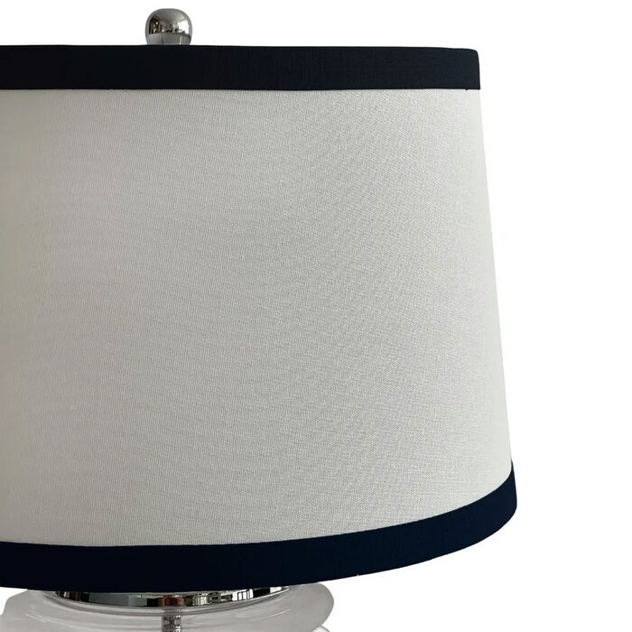 With its sleek glass base, crisp white linen shade, and black trim, this lamp effortlessly blends timeless elegance with modern flair.