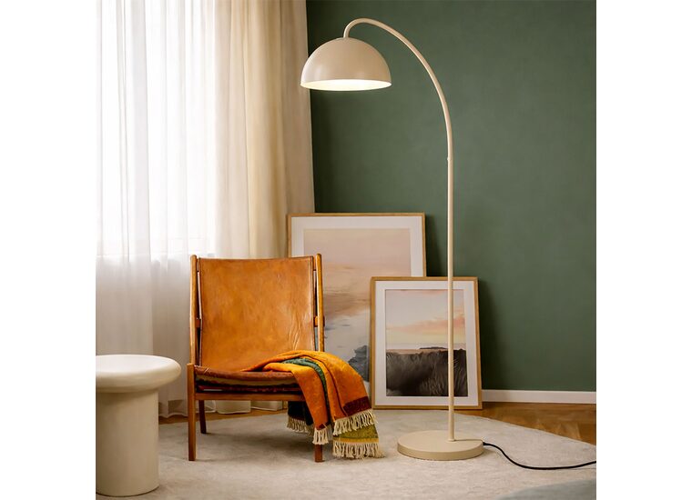 Its clean, arched silhouette and domed shade reflect a soft modern style influenced by mid‑century minimalism.