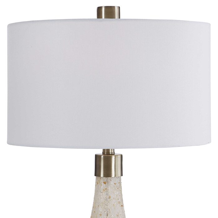 This table lamp features a heavily textured art glass base in shades of cream, ivory, and rust brown, accented with brushed antique brass plated details.