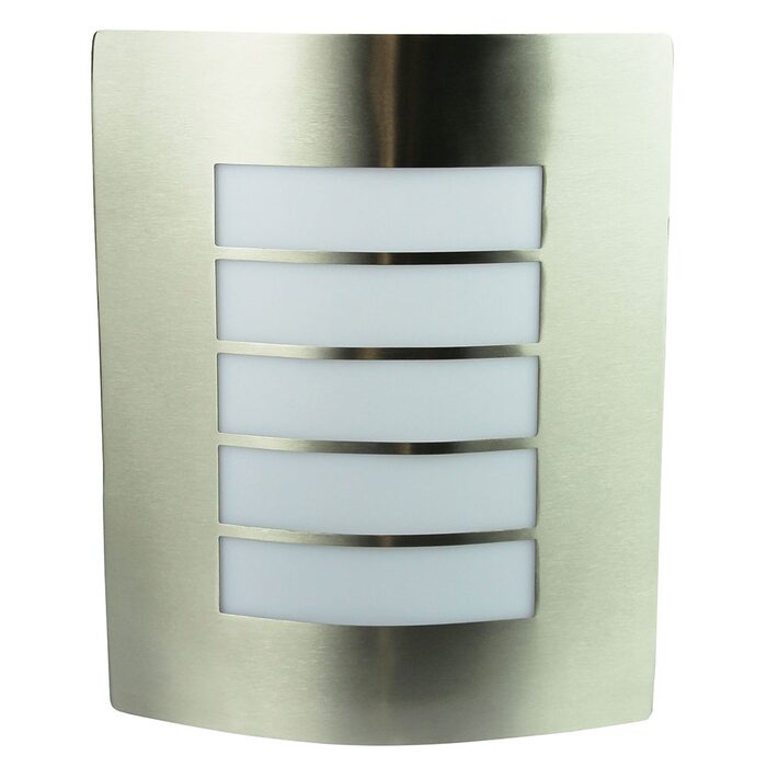Double insulated, opal acrylic exterior (IP44) wall light with a stainless steel face plate. Perfect for use with an LED globe.