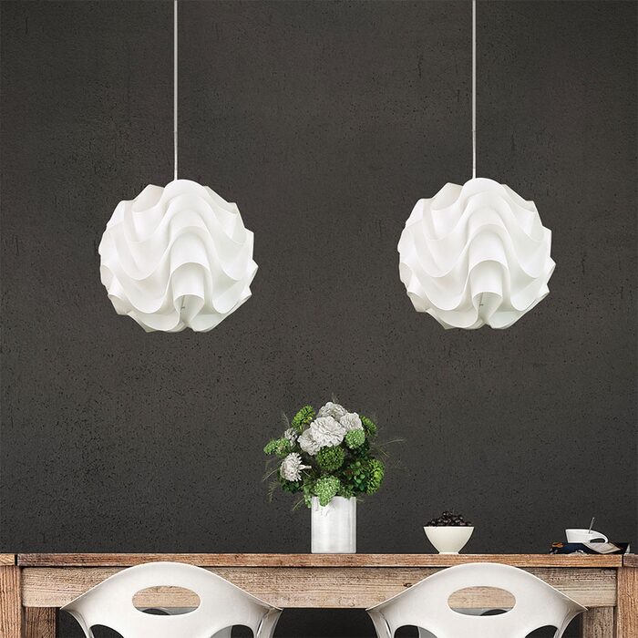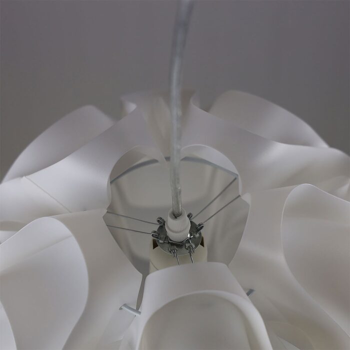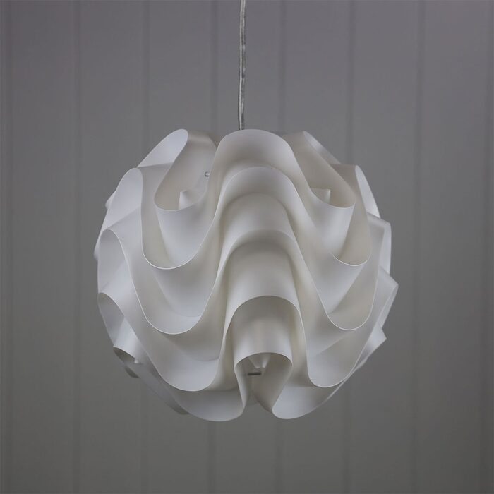 CHIC pendant is the reproduction of a timeless design. CHIC features a white, wavy poly-propylene spherical shade, with a clear cord suspension and white canopy.