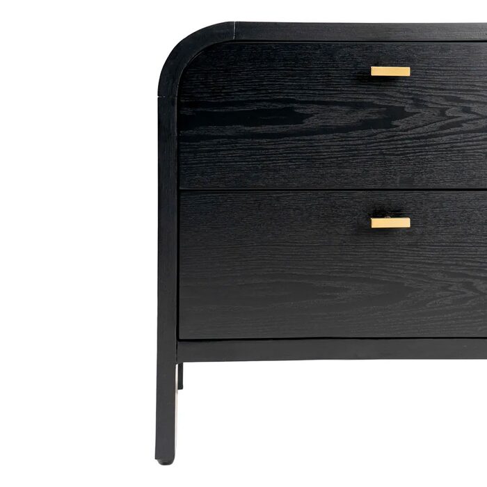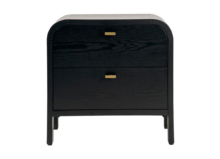 Featuring a gently curved silhouette crafted from beautifully grained ash wood veneer in a chic black painted finish, the Chisholm bedside table offers true versatility.