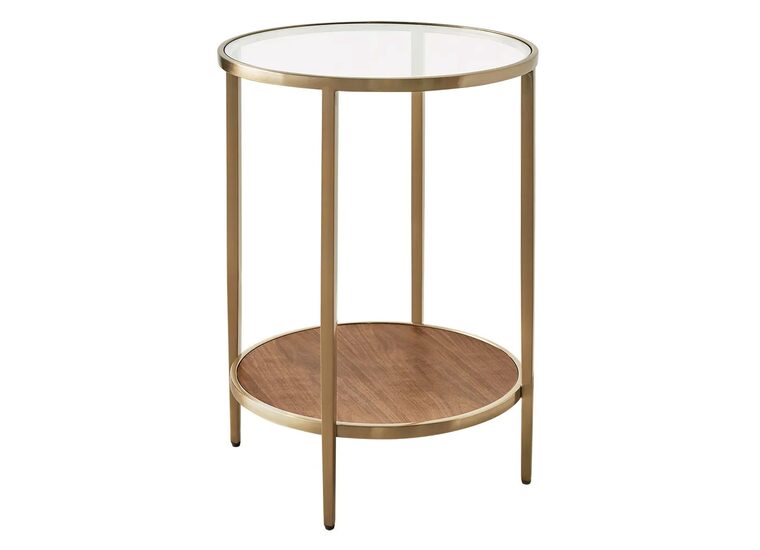 Featuring a clear tempered glass top and a lower tier in smooth light walnut wood veneer, both framed by a lustrous brushed gold stainless steel structure, this piece exemplifies the art of balanced aesthetics.