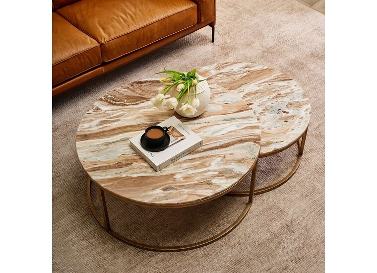 Make a bold yet graceful statement with the Chloe Pink Marble Nesting Coffee Tables in Gold—where timeless beauty meets everyday function.
