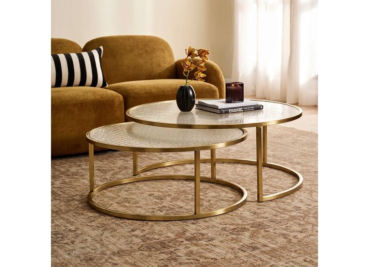 The Chloe Rippled Glass Nesting Coffee Tables in Gold are a stylish cornerstone of the Chloe Rippled Glass Collection, blending contemporary form with elegant design—a key insight for interior designers enriching client spaces.