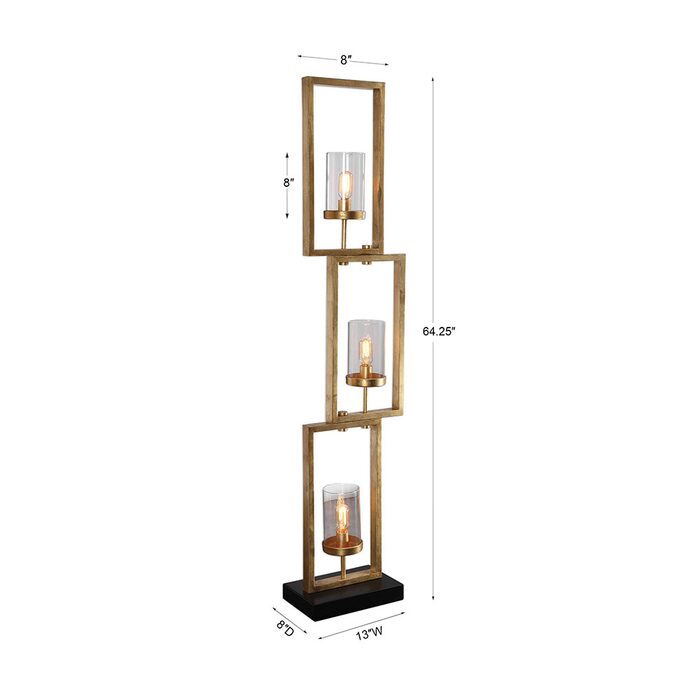 Clean, geometric lines open the visual space around this modern floor lamp. Staggered steel rectangles finished in lightly antiqued gold leaf are each accented by a clear glass globe.