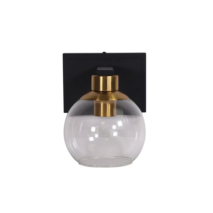 The Clayton wall light features satin brass and black metalware with clear glass.