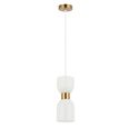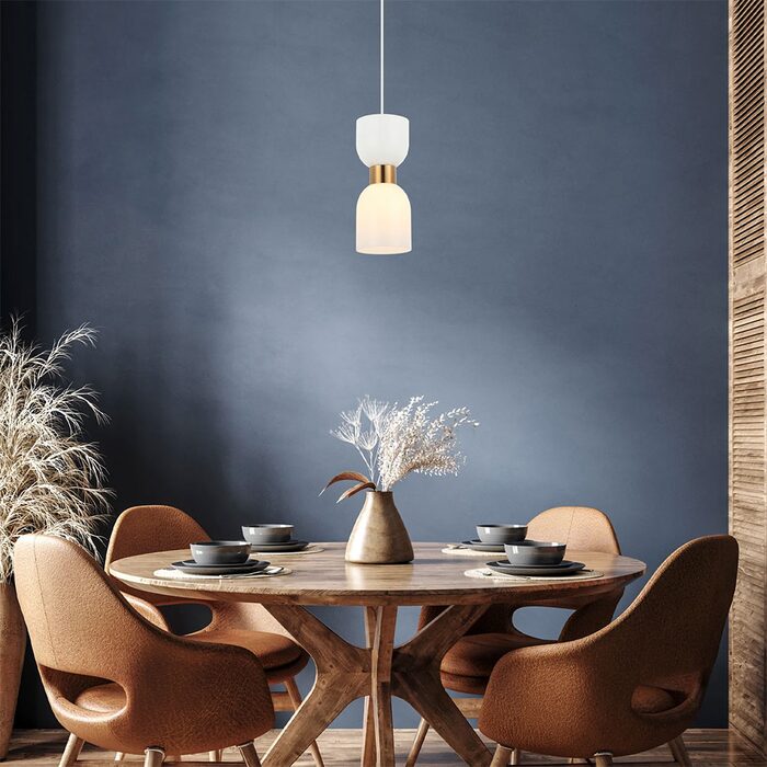 This contemporary pendant has a brass fixture from which the elegant opal glass shade hangs.