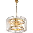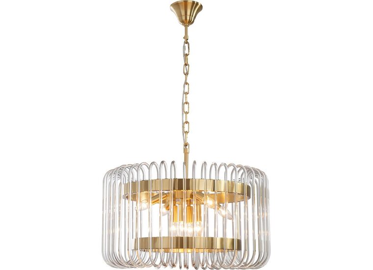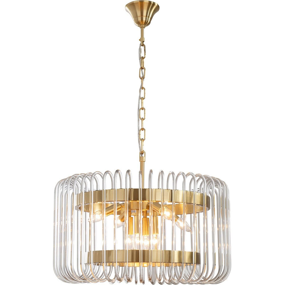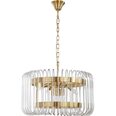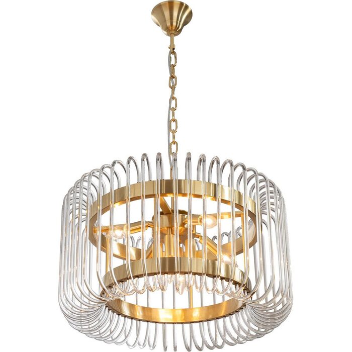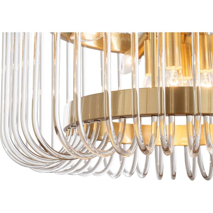 Available in three sizes with single or double-tier options, each piece showcases sleek satin brass metalware paired with cascades of clear glass rods for a dazzling effect.