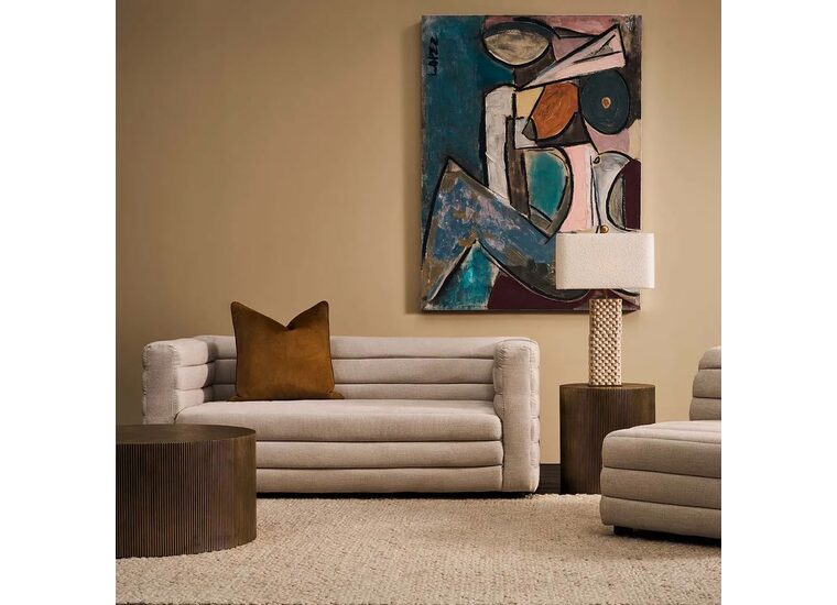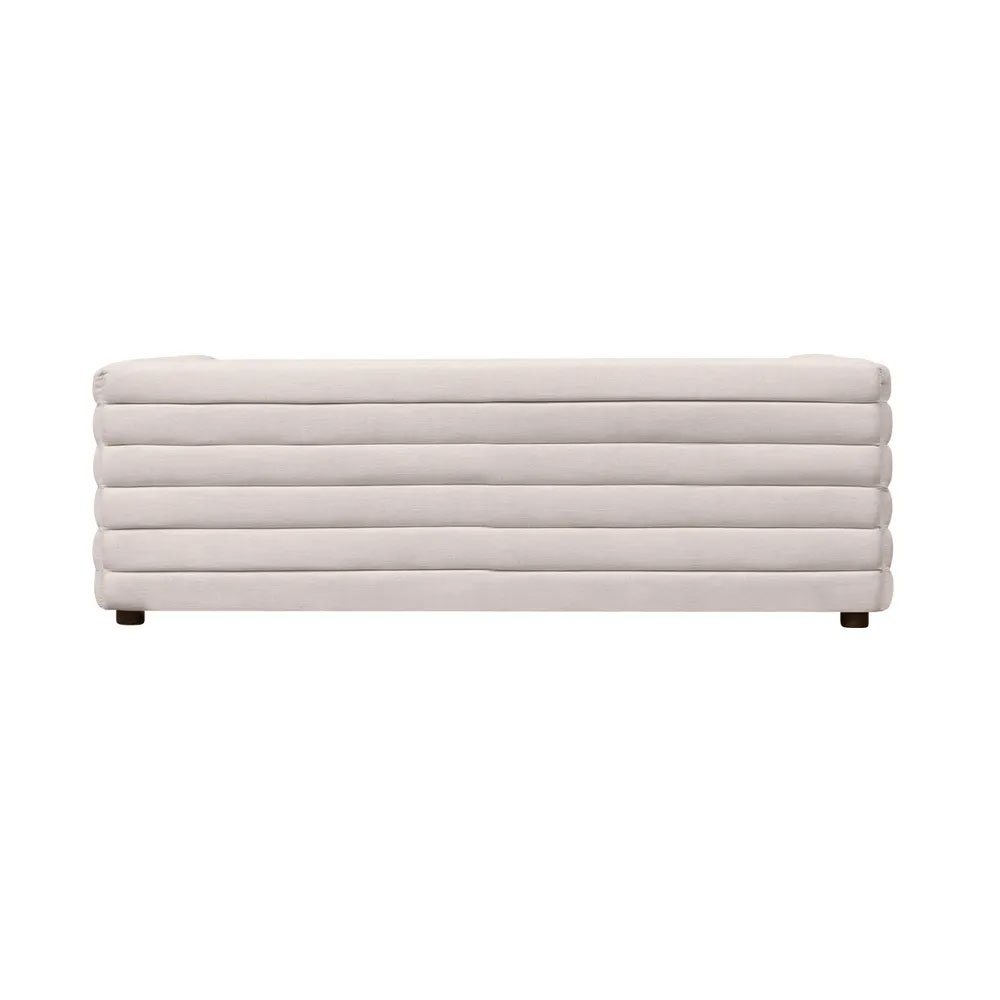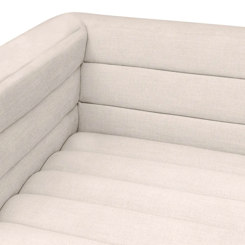 Plush channel tufting in a natural linen blend fabric complements a sturdy hardwood frame and spring suspension for lasting durability and exceptional comfort.