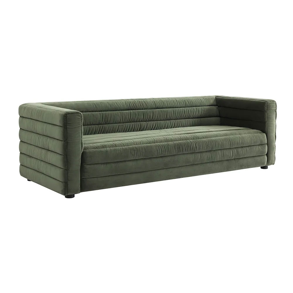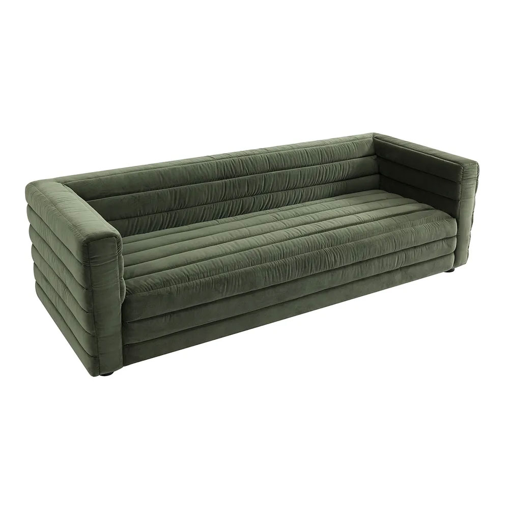 Upholstered in a luxurious satin moss fabric, its smooth texture enhances the sofa’s sculptural, channel-stitched silhouette.