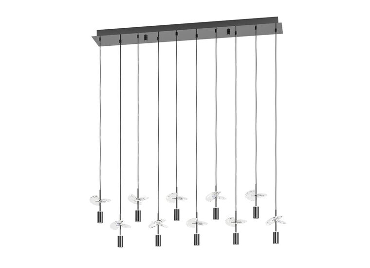 The COMAREIRA pendant light has ten decorative flower-inspired light elements on cables suspended from an elongated nickel metal canopy.