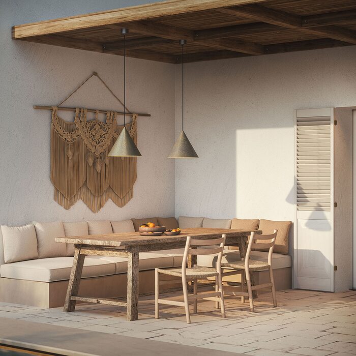 It features an efficient light emission that defines the furnished spaces. Intended for outdoor environments, this fixture measures H21 x W25cm and is made of brass.