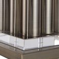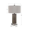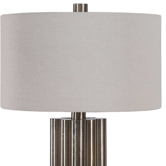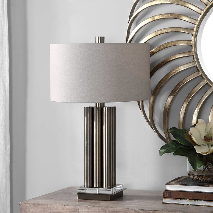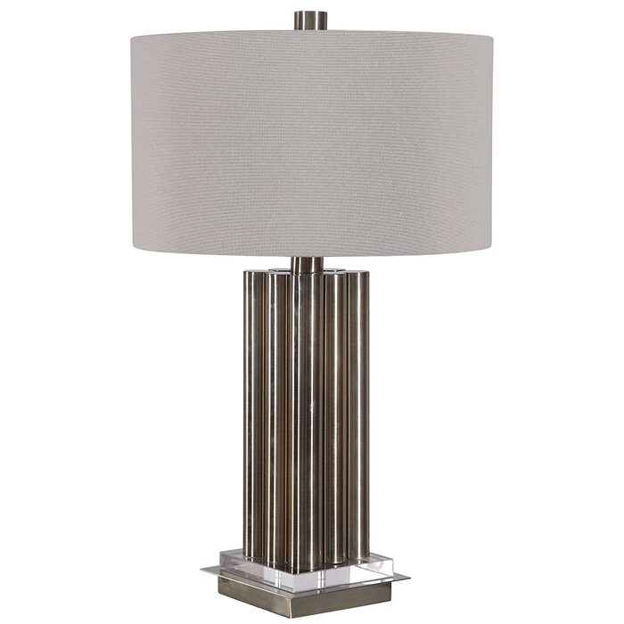 This table lamp has a modern look that features large metal dowels that are finished in a plated lightly antiqued brass, accented with elegant crystal details.