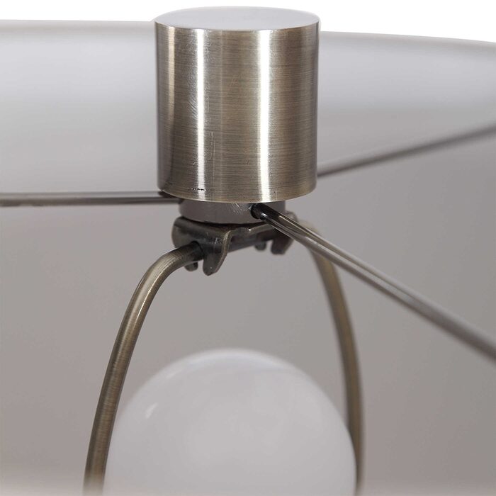 The hardback drum shade is a beige linen fabric.