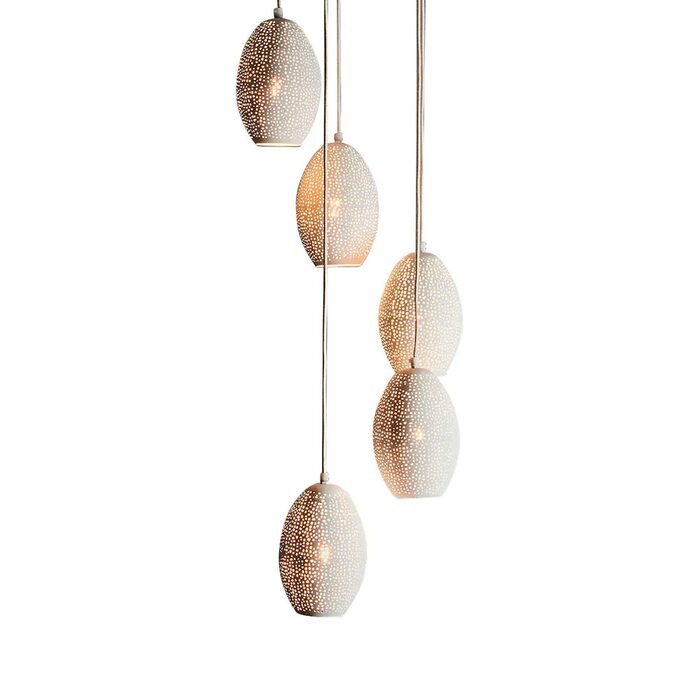 A cascading cluster of delicately perforated lozenge shaped white shades. These multi light pendants are perfect for impact stairwells and voids.