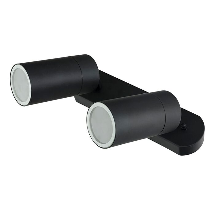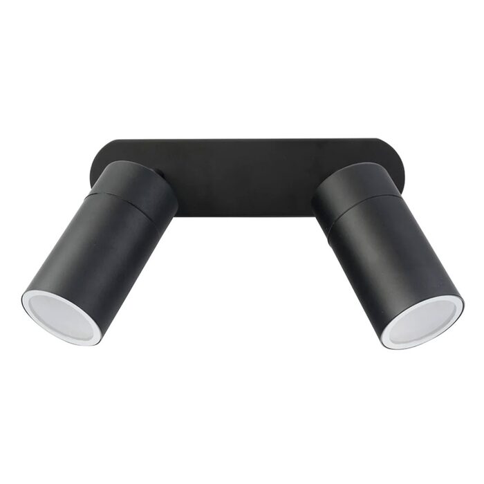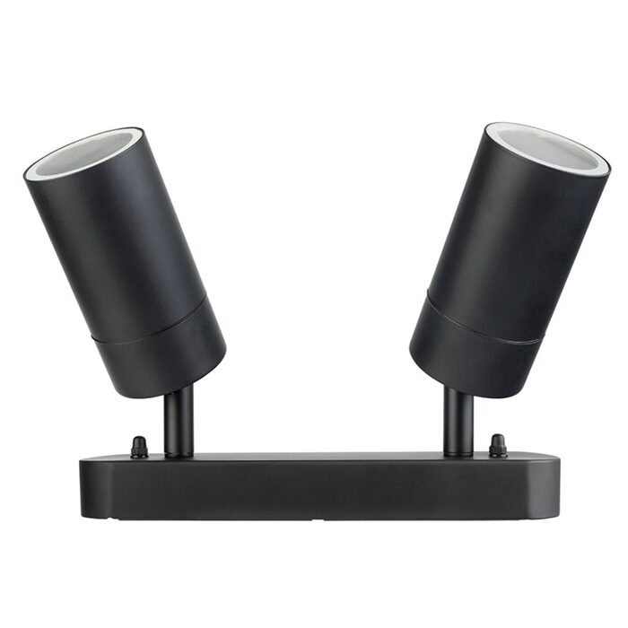 This twin-head exterior light is designed for wall or ceiling configuration, stainless steel body powder coated.