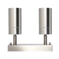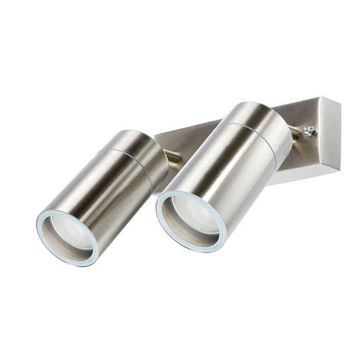 This twin-head exterior light is designed for wall or ceiling configuration, stainless steel body powder coated.