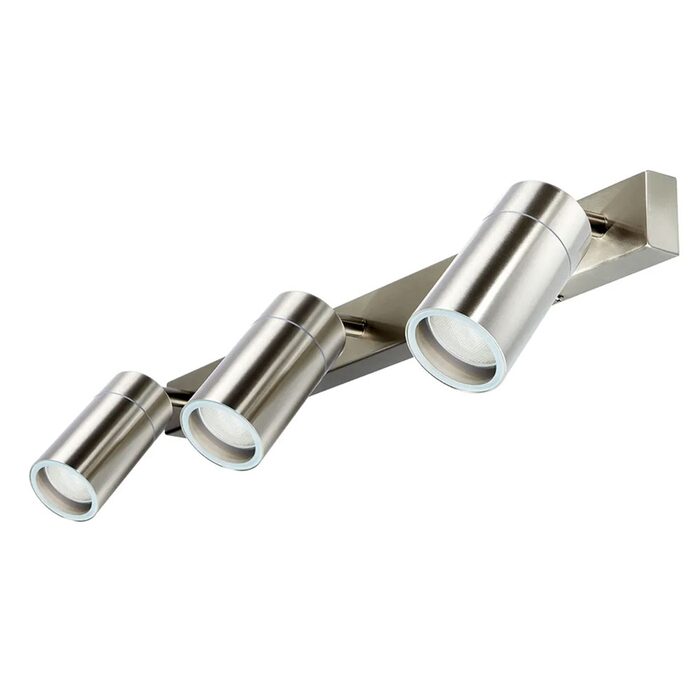 This triple-head exterior light is designed for wall or ceiling configuration, stainless steel body powder coated.