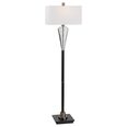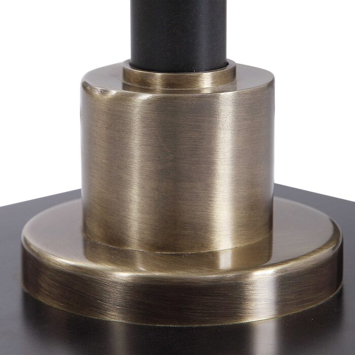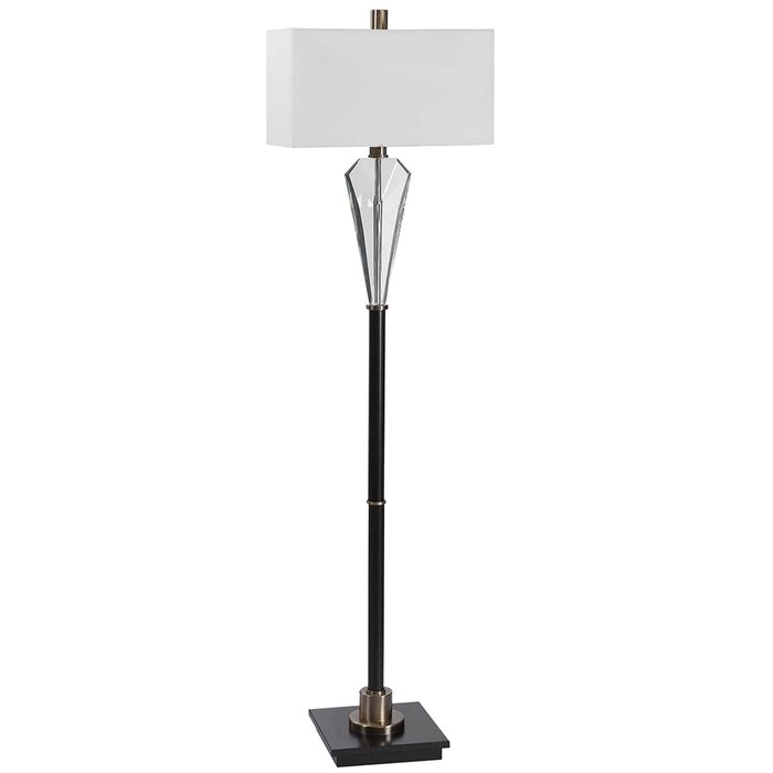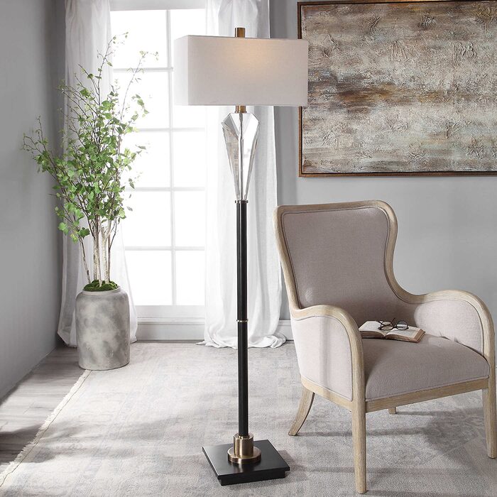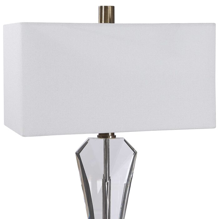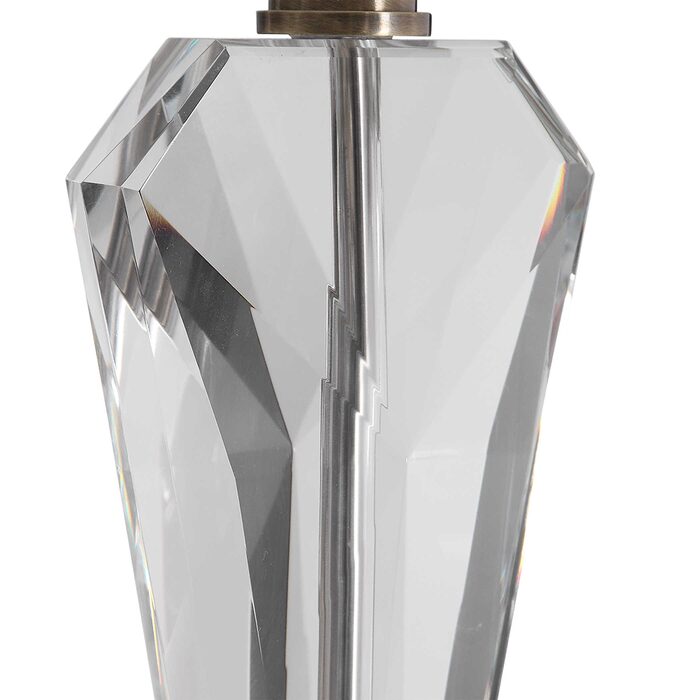 This contemporary piece showcases an elegant design with clean lines and sophisticated elements like the thick cut crystal accented base and antique brass plated details.
