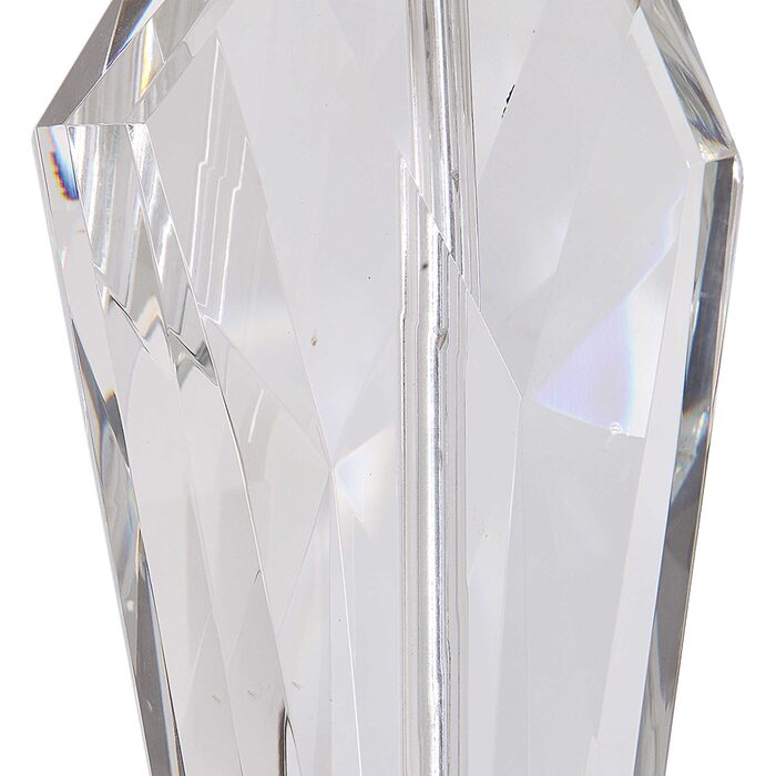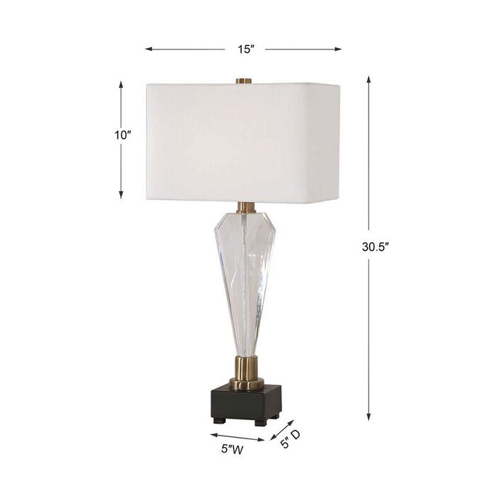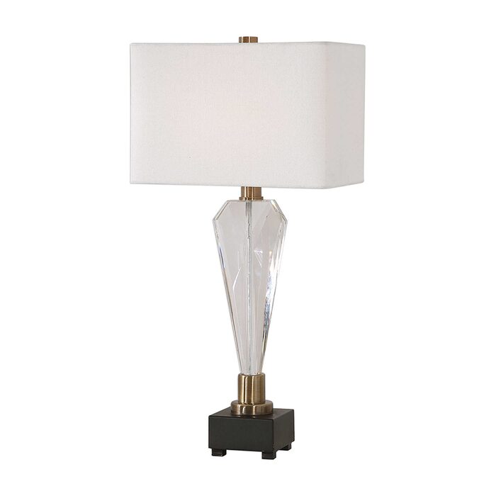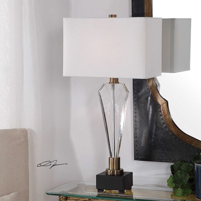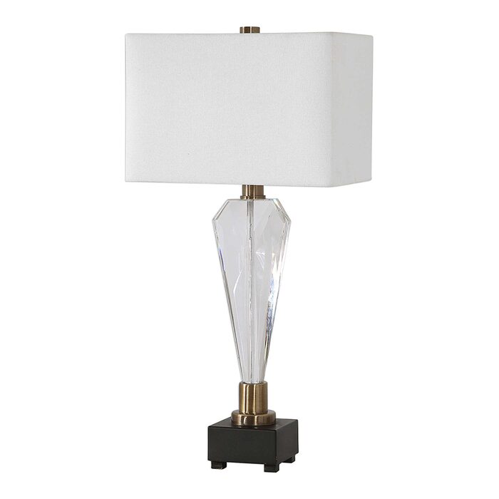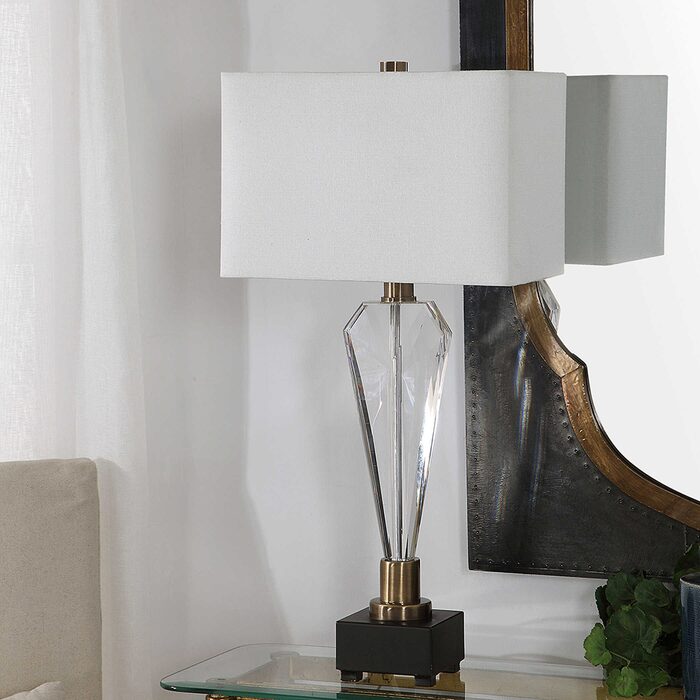This contemporary piece showcases an elegant design with clean lines and sophisticated elements featuring a geometric crystal base that's accented with antique brass plated details.