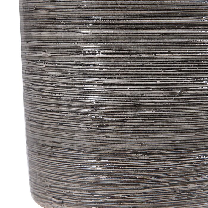 The hardback drum shade is light gray linen fabric with slubbing.