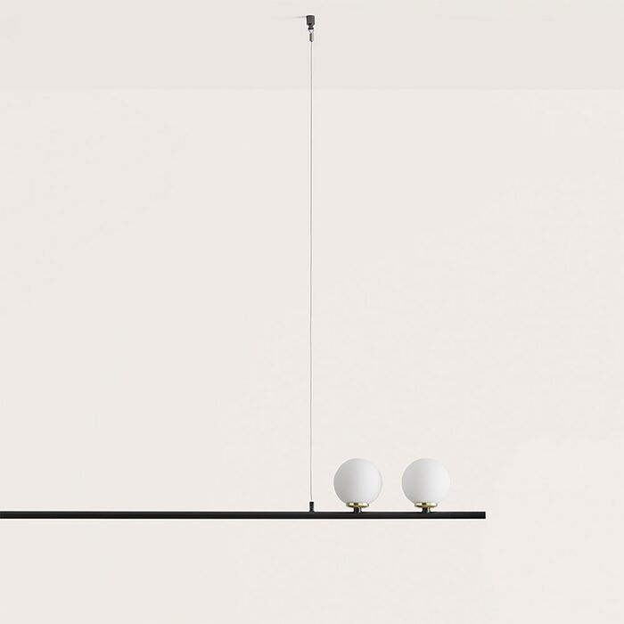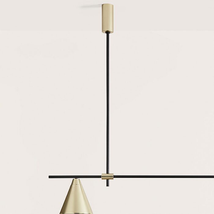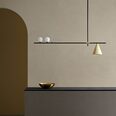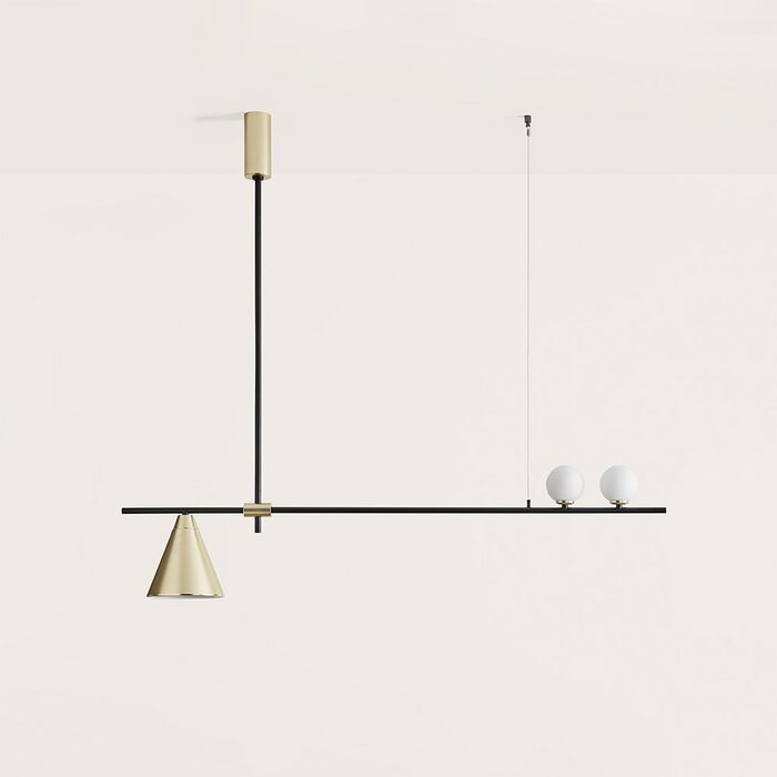 Crane Pendant Light designed by JF Sevilla for Aromas Del Campo is a unique design with two spheres at the end of the metal bar that illuminates a soft glow while at the other end is a conical light that directs down.