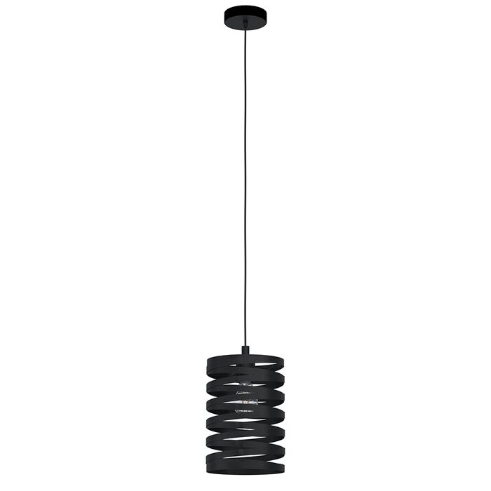 The decorative Cremella pendant light features black steel bands that spiral into a drum shade.