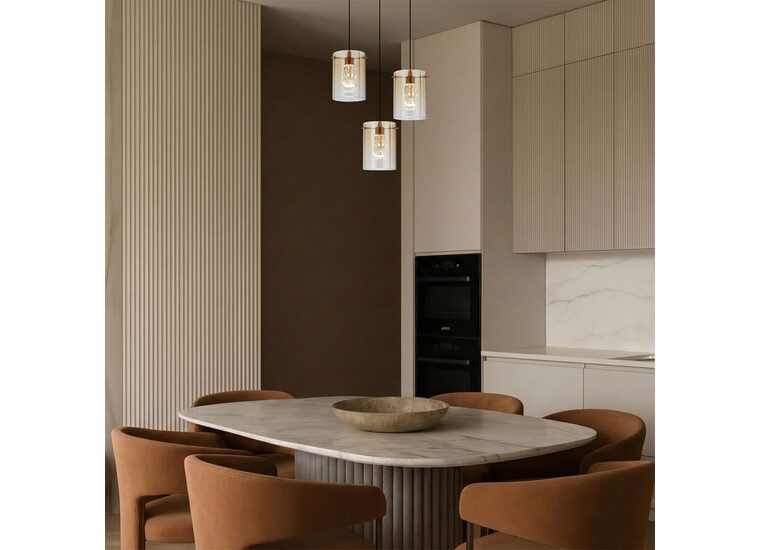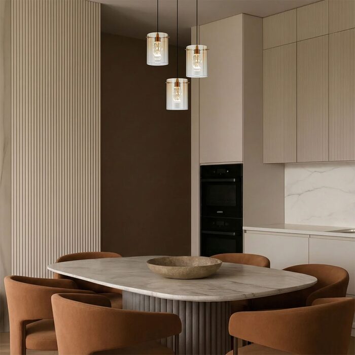 The Crevil collection pairs sturdy iron construction with refined glass shades, available in black with smoke glass or antique gold with amber glass.