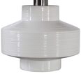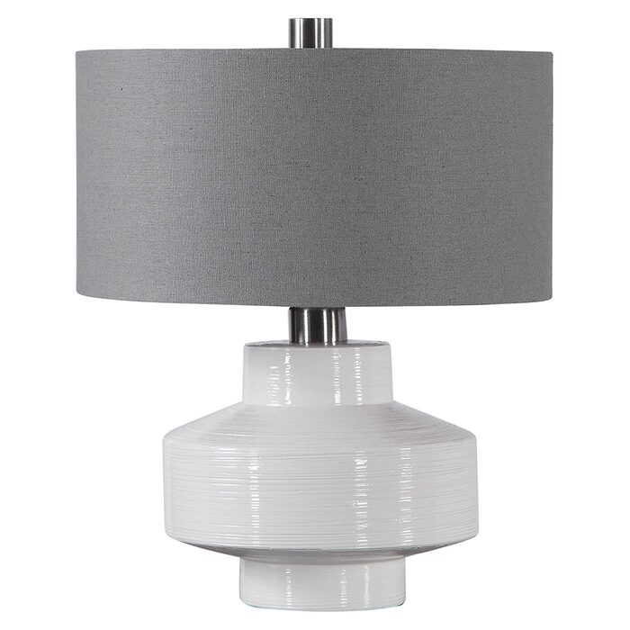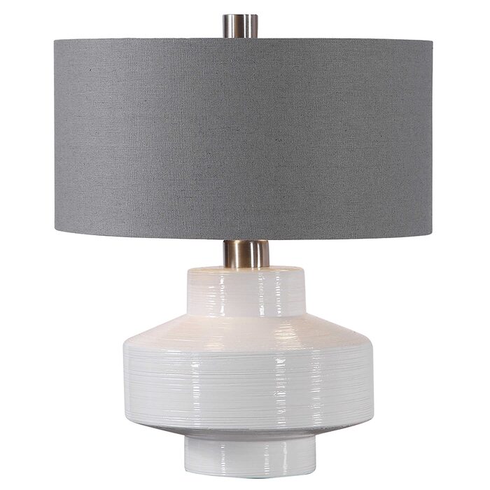 This mid-century inspired table lamp has a white ceramic base with ribbed texture and brushed nickel accents.