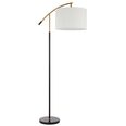 Its arching metal arm in antique gold, anchored by a sleek marble base, creates a striking contrast with black enamel accents.
