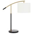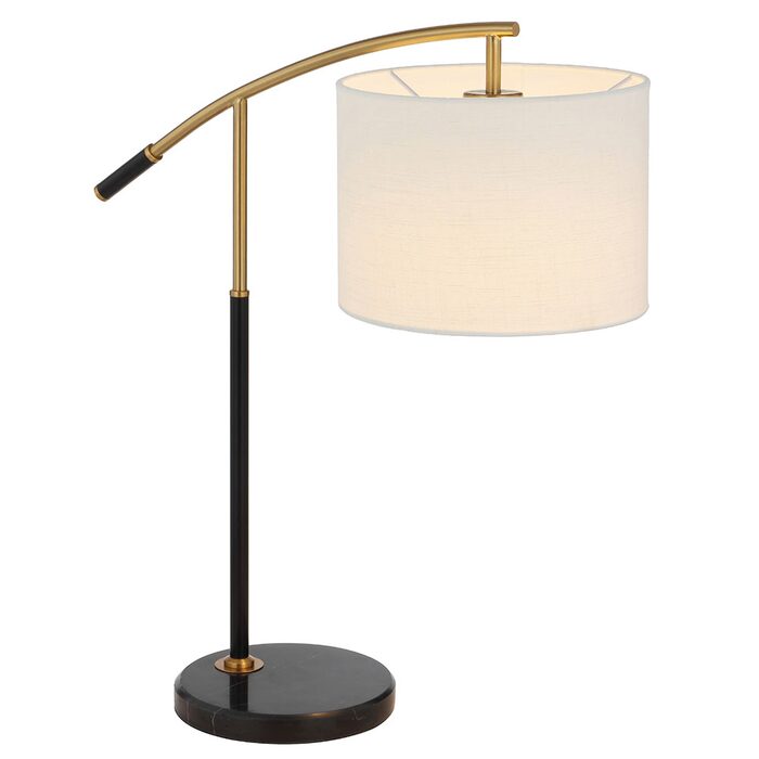 Its arching metal arm in antique gold, anchored by a sleek marble base, creates a striking contrast with black enamel accents.
