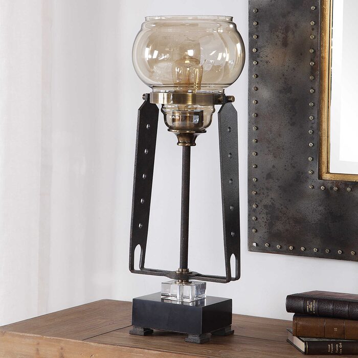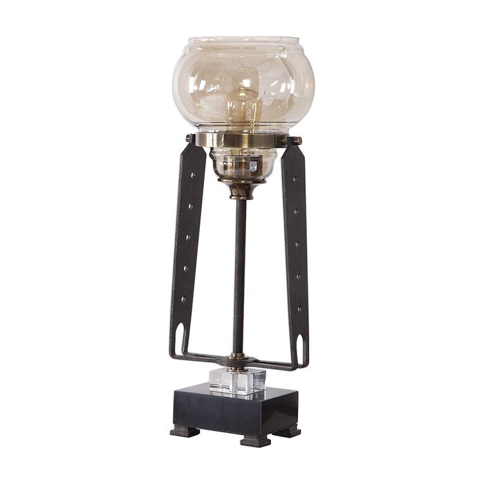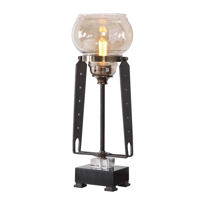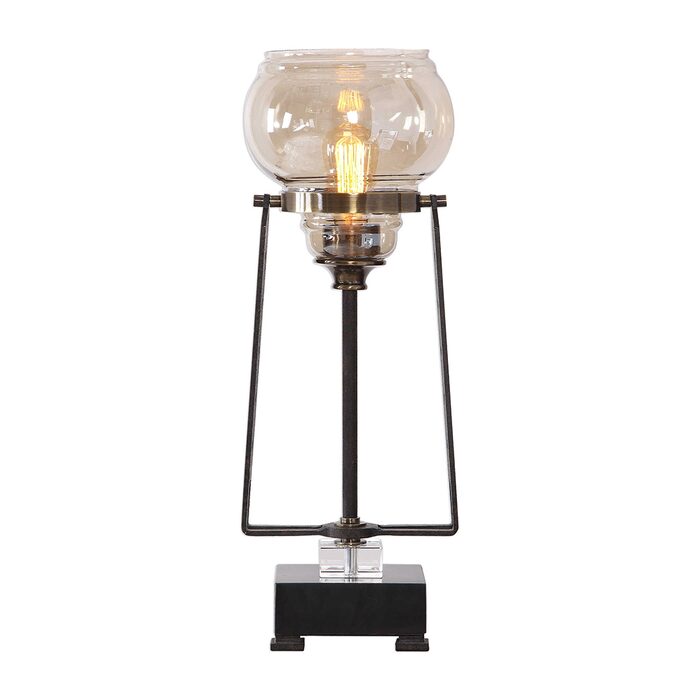 A round amber glass globe is supported by a forged iron stand with plated antique brass accents.