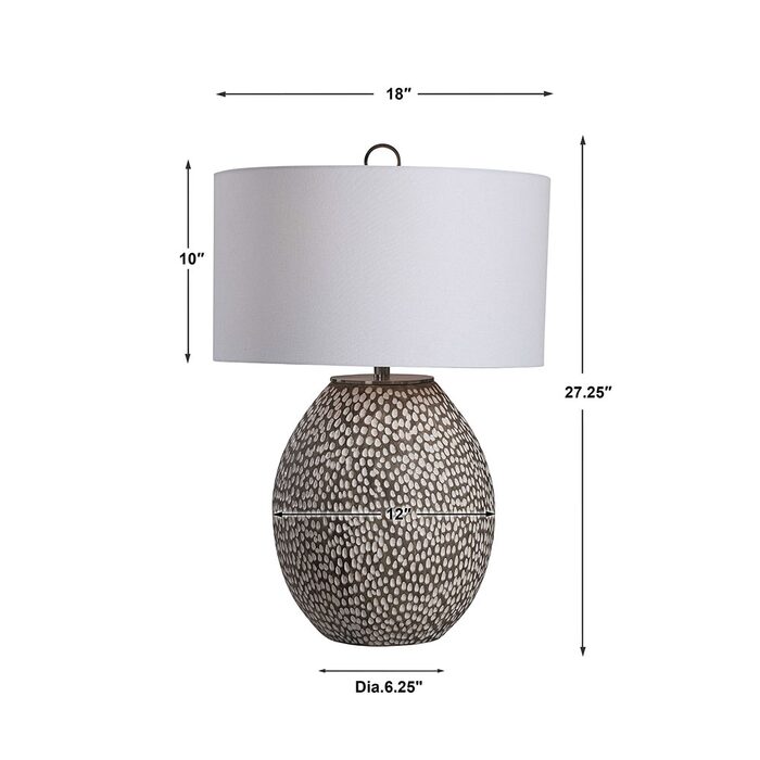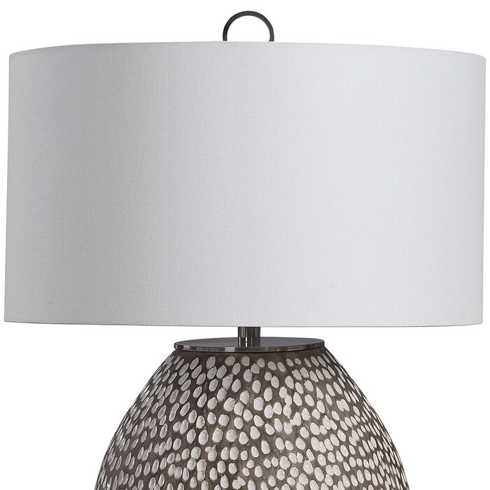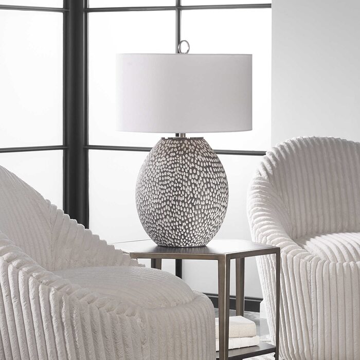 This ceramic table lamp features a heavily pitted surface finished in a combination of brushed rustic gray and crackled gloss white glaze, paired with brushed nickel plated iron details.