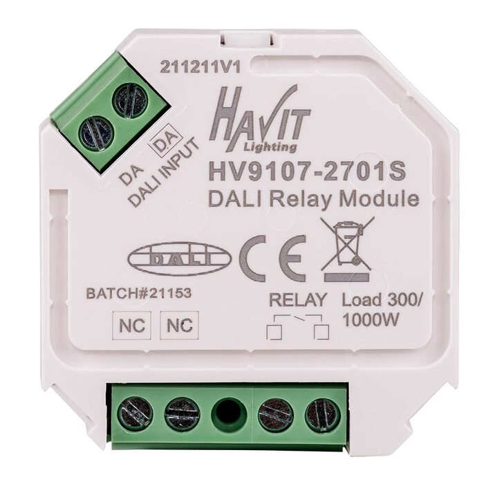 The Havit HV9107-2701S-N is a 240V white plastic DALI on-off relay module designed to control standard lighting via DALI signals.