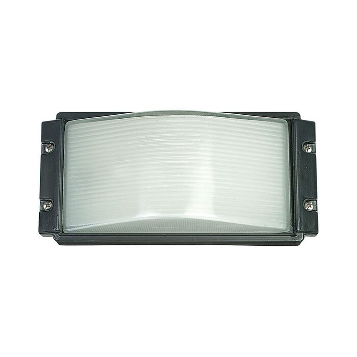 Rectangular outdoor bulkhead suited to wall or ceiling mount. Black powdercoated plain di-cast aluminium trim encasing a curved glass lens. Ideal for use with an LED globe. IP54.