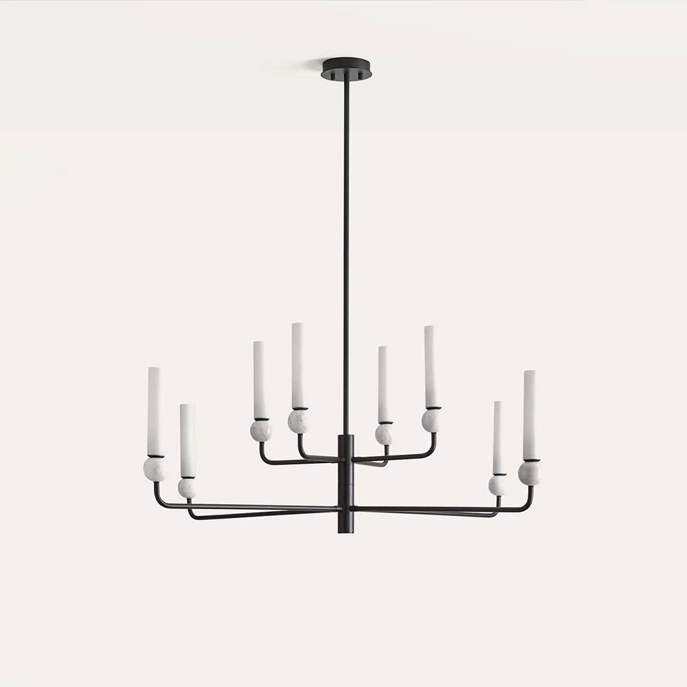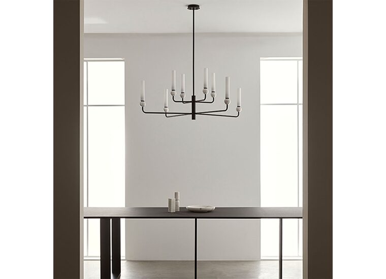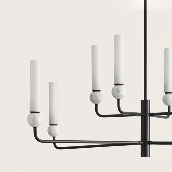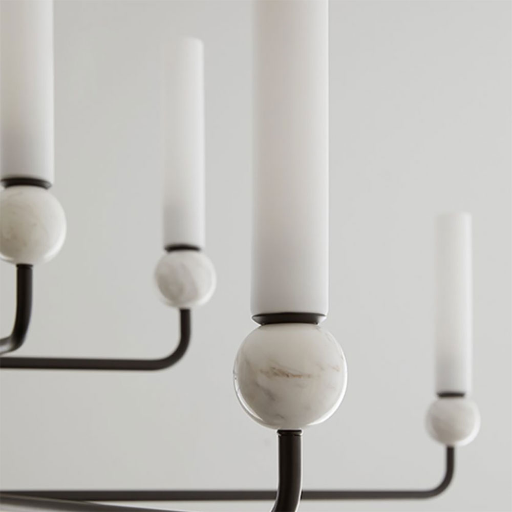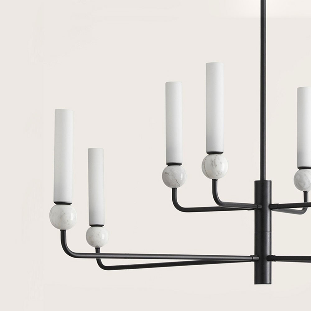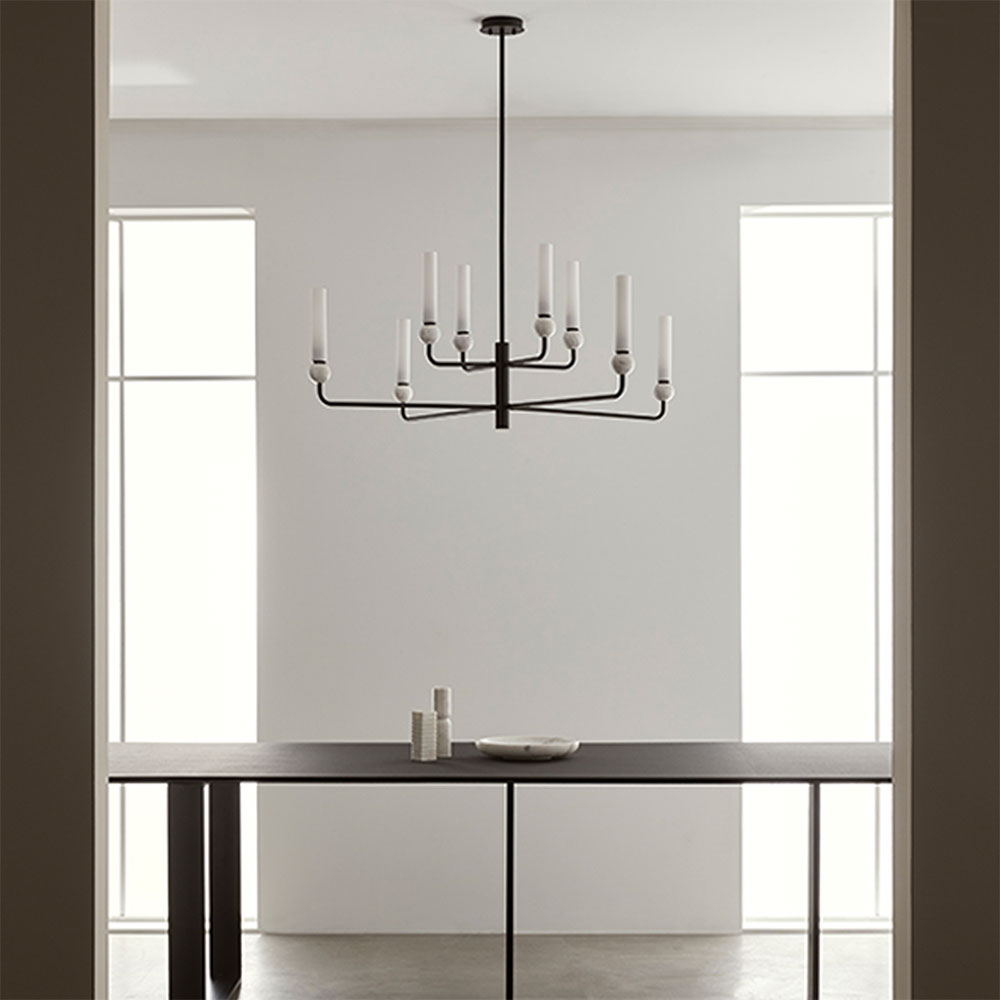 Delie 8lt Pendant Light designed by JF Sevilla for Aromas Del Campo is designed with delicate steel arms combined with opal glass shades, creating a chandelier effect.