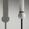Situated at the top of the light is a tubular opal glass light source illuminating a soft warm glow, which contrasts with the spherical marble piece and metal structure.