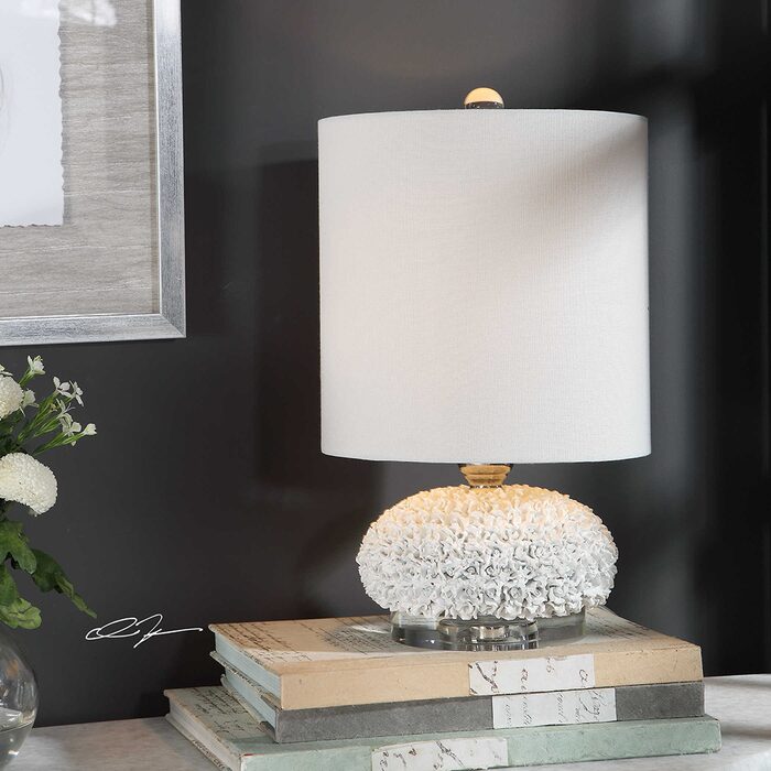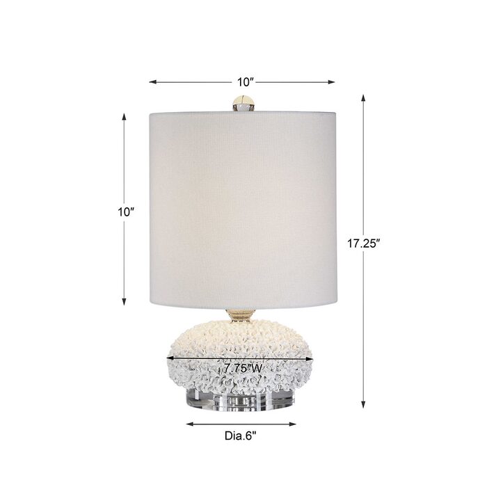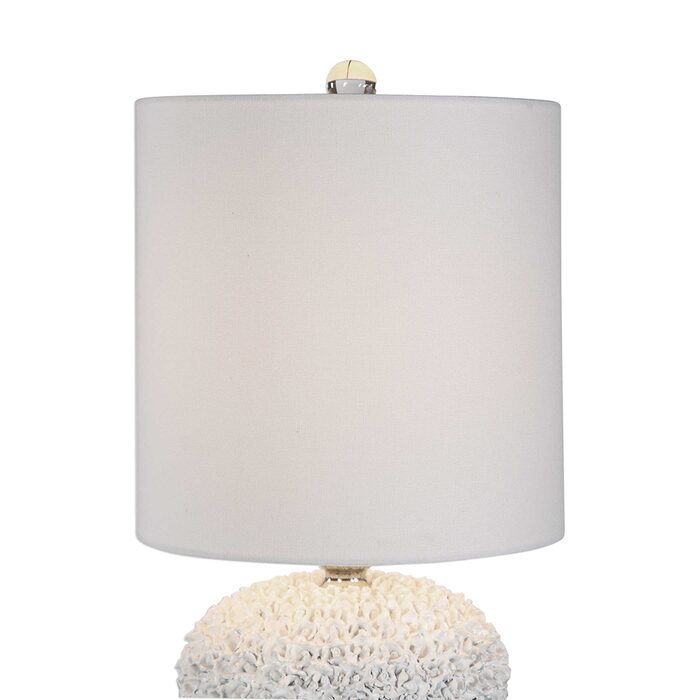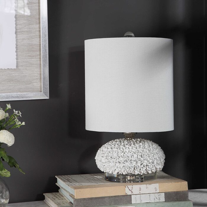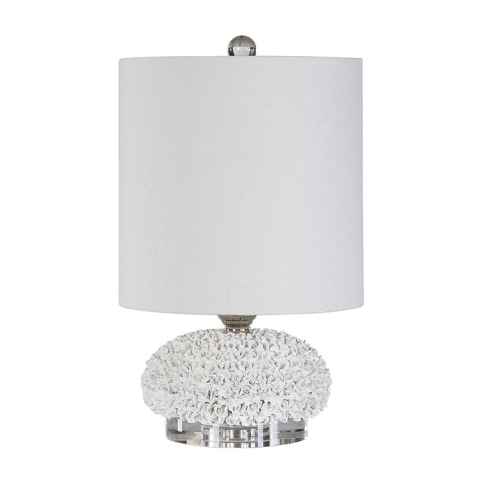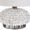 This elegant lamp features a shapely, carved base with delicate floral accents, displayed on a thick crystal foot with a matching finial and polished nickel plated details.