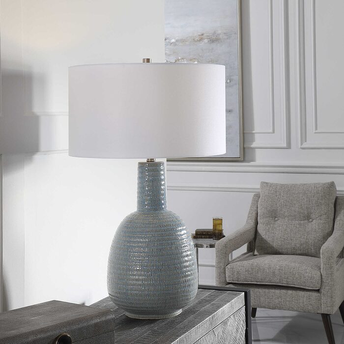 Simple yet sophisticated this ceramic table lamp is finished in a distressed light aqua glaze with intricate hand carved texture, accented by brushed nickel details.