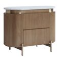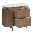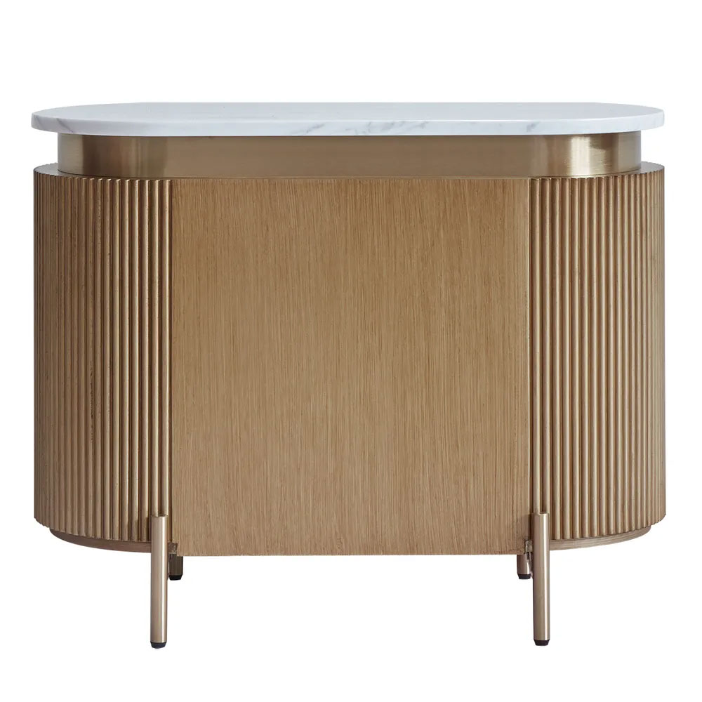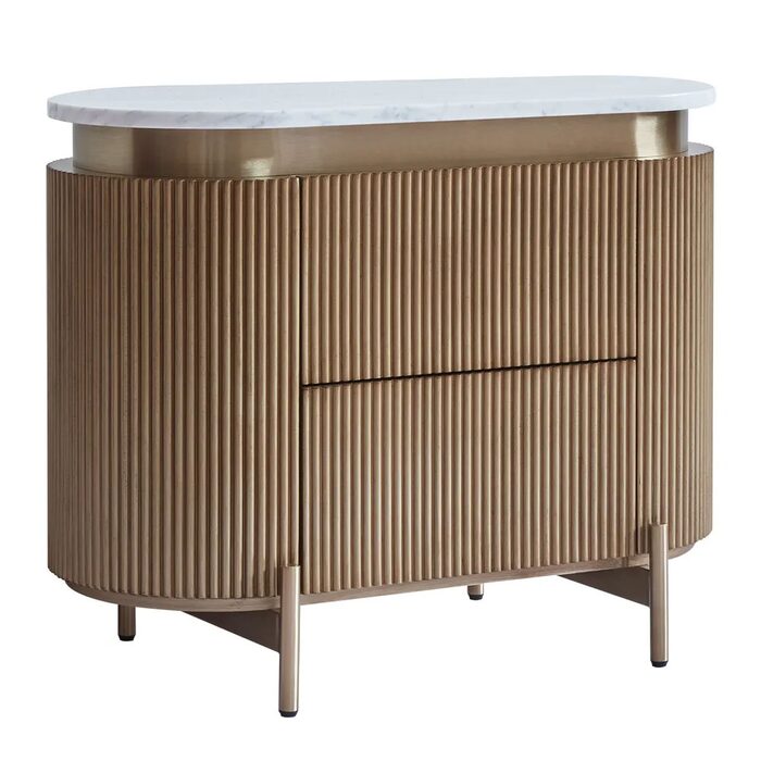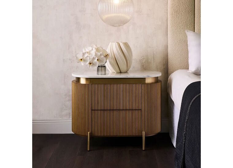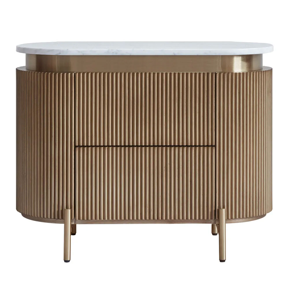 Featuring a warm antique gold finish, ribbed detailing, and a luxurious white Carrara marble top, these tables offer ample storage with smooth pull-out drawers.