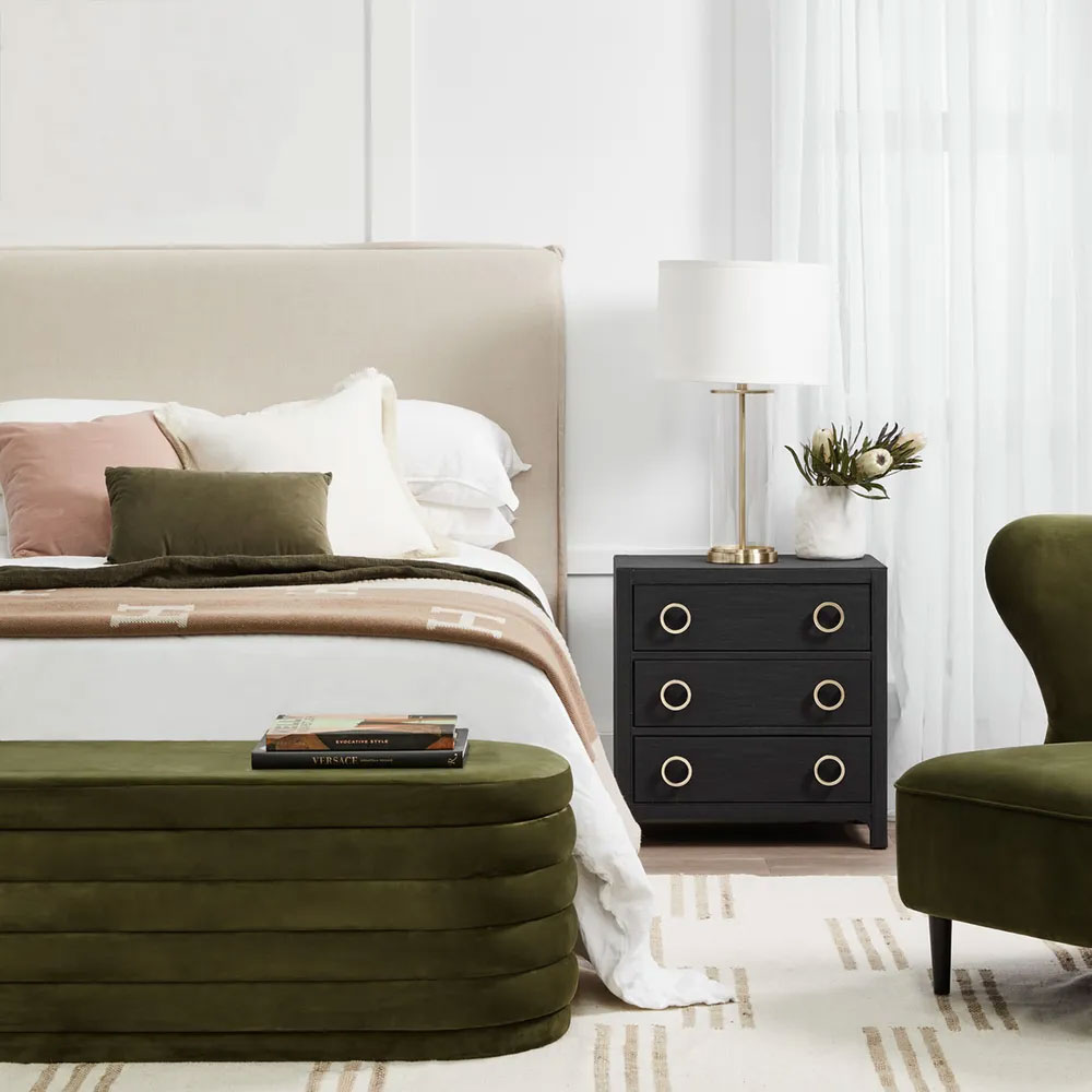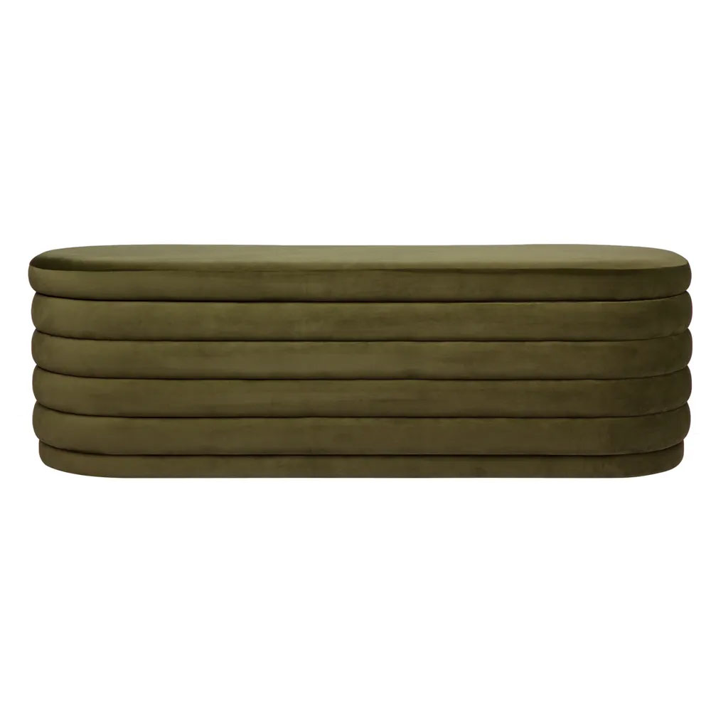 Designed with an effortlessly chic cosmopolitan mood in mind, the panelling detail of the Demi storage bench ottoman enhances its textural quality and adds to its contemporary curve appeal while the delicious olive tone adds personality, bringing the calming tones of nature indoors.