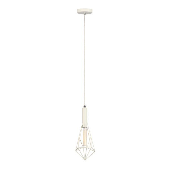 Featuring a single white steel cage suspended from a white cord and ceiling canopy, this pendant makes excellent use of its geometric shapes to delightfully compliment the exposed globe.