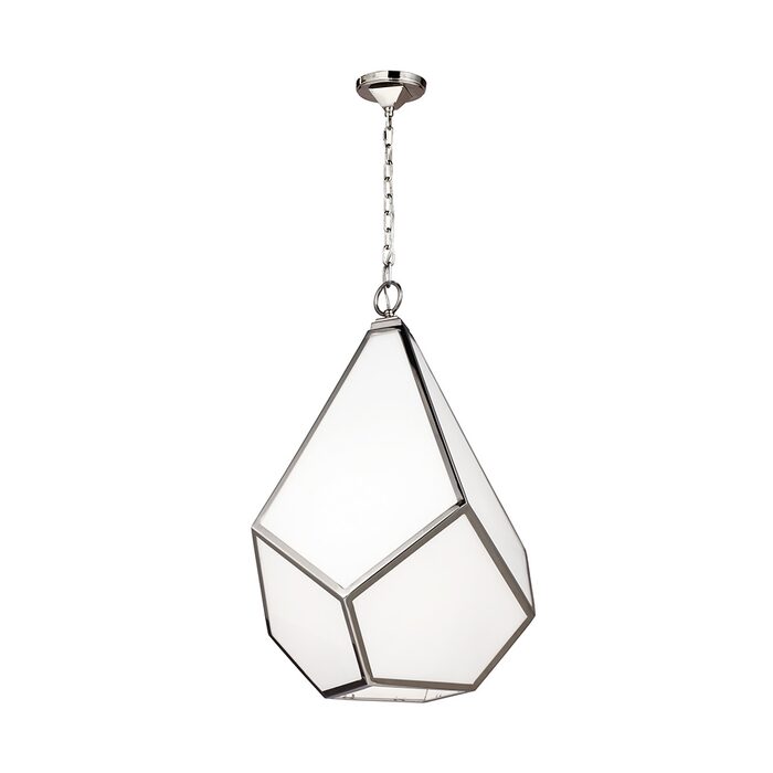 Inspired by stained glass, the Diamond collection features modern, large scale pendants with dramatic facets made of individual panes of glass in a metal frame.