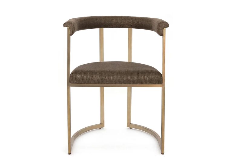 Upholstered in rich chocolate linen, the curved backrest and cushioned seat deliver refined support, while the antique brass finished frame adds contrast and a touch of luxury.