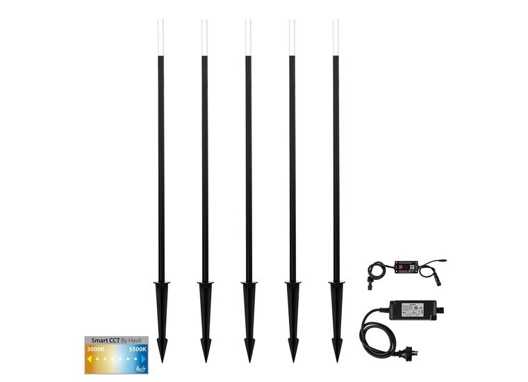 The HV1514CCT-BLK-KIT is the Havit Drique Aluminium Black CCT 5 Light LED Bollard Spike Light Kit, designed for outdoor landscape, path, and garden lighting.
