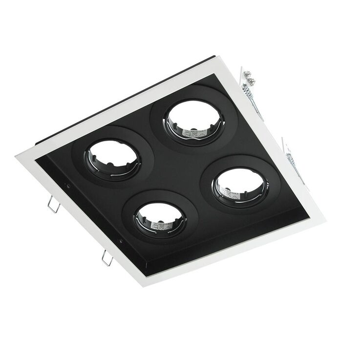 Recessed four light square Slotter downlight, powder coated trim, steel frame, die-cast tilt downlight housing, IP20.