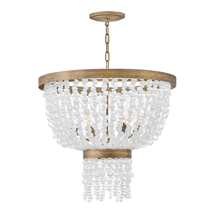 Dune’s bohemian chic design showcases strands of soft white sea glass combined with a Burnished Gold finish.